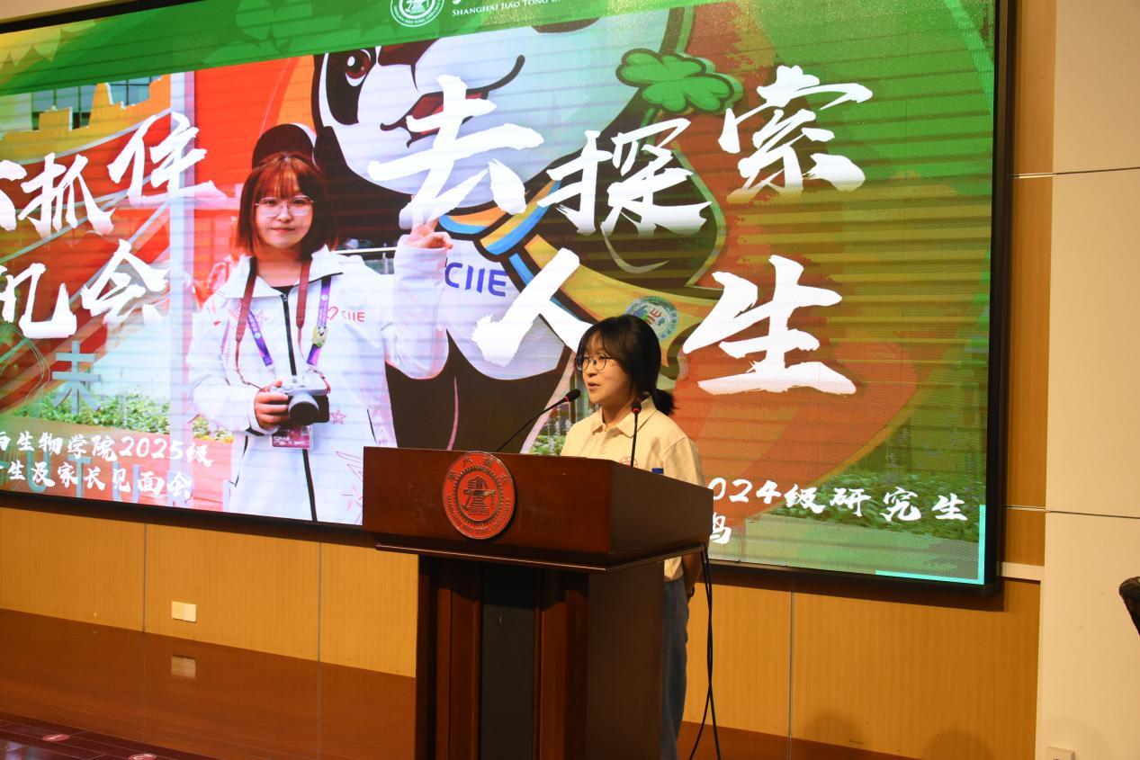 2024级食品科学与工程系硕士生孙梦鸽作为在校生代表,结合自身从本科到硕士的成长经历,分享了大学学习方法、生活适应技巧等,并鼓励新生珍惜大学时光,主动探索兴趣与方向,化解从高中到大学的过渡迷茫,从被动转变成主动。