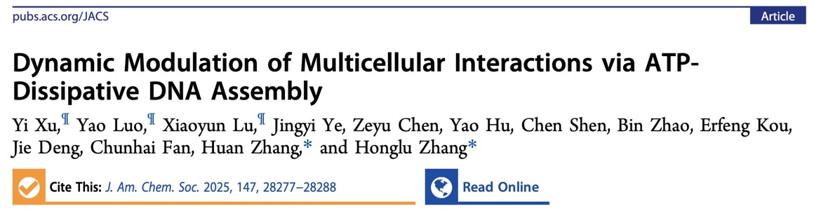 近日,成人综艺-台湾成人综艺-成人视频 张欢团队与自动化与感知成人综艺张宏陆团队、四川大学华西医院罗耀团队合作,在高水平学术期刊Journal of the American Chemical Society上发表了题为“Dynamic Modulation of Multicellular Interactions via ATP-Dissipative DNA Assembly” (J. Am. Chem. Soc. 2025, 147, 28277)的最新研究成果 。该研究工作利用DNA的可编程性和分子识别能力,构建了一种由ATP驱动的耗散自组装系统,实现了对活细胞间相互作用的动态、可逆和时空精准的调控,并将这一策略有效地应用于肿瘤免疫治疗中。该系统模拟了生物系统中能量依赖的瞬时相互作用,为开发新型智能生物材料和免疫疗法提供了全新思路。